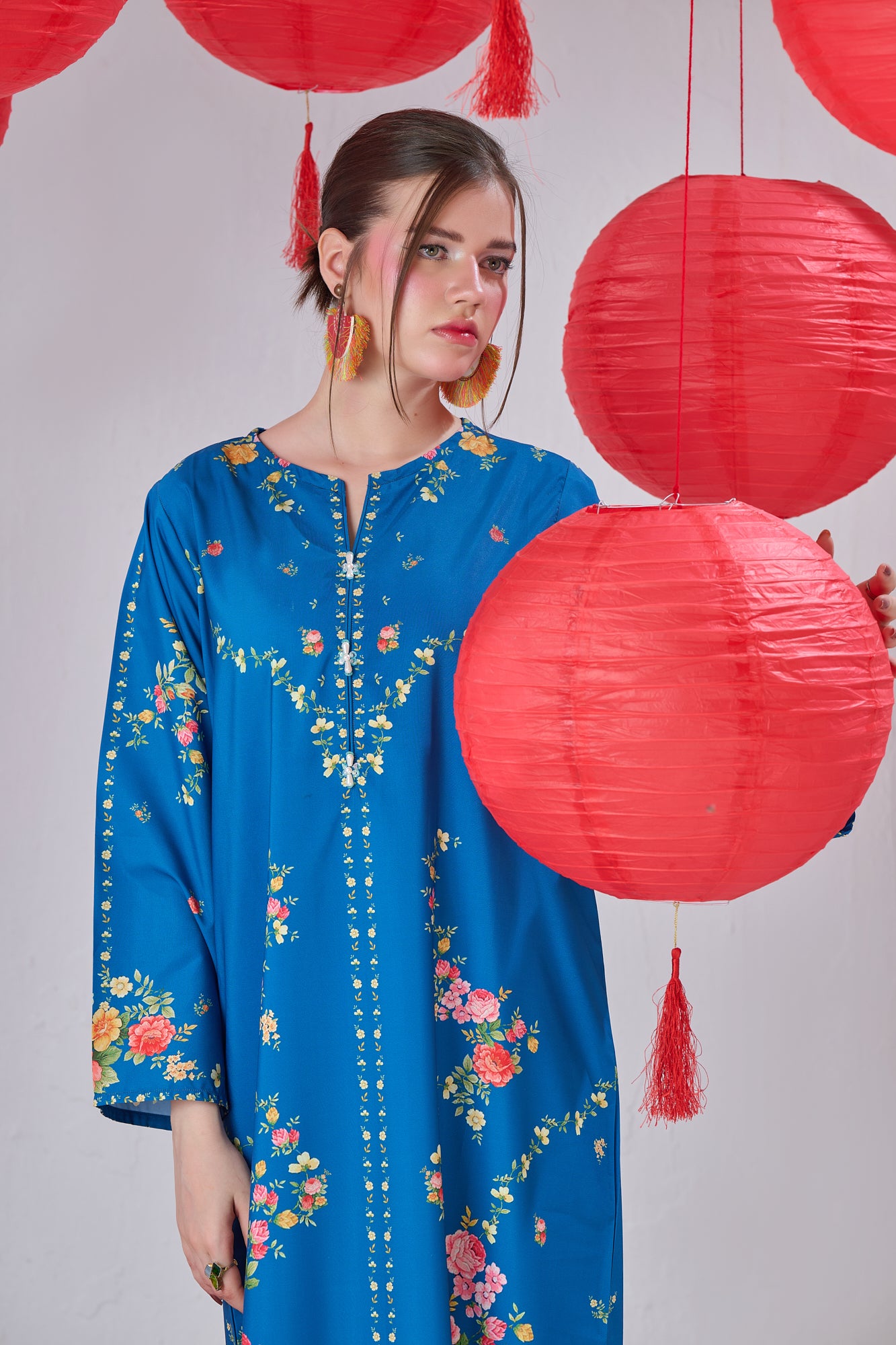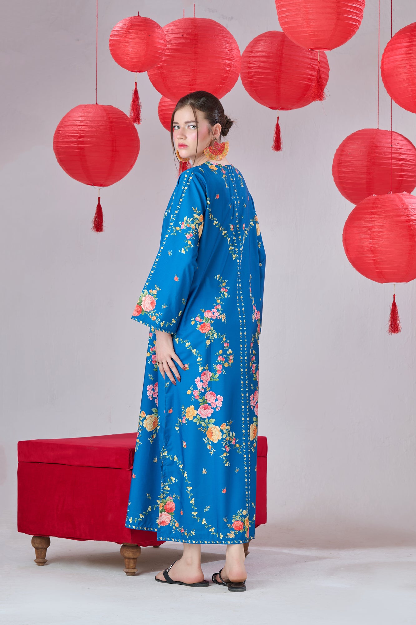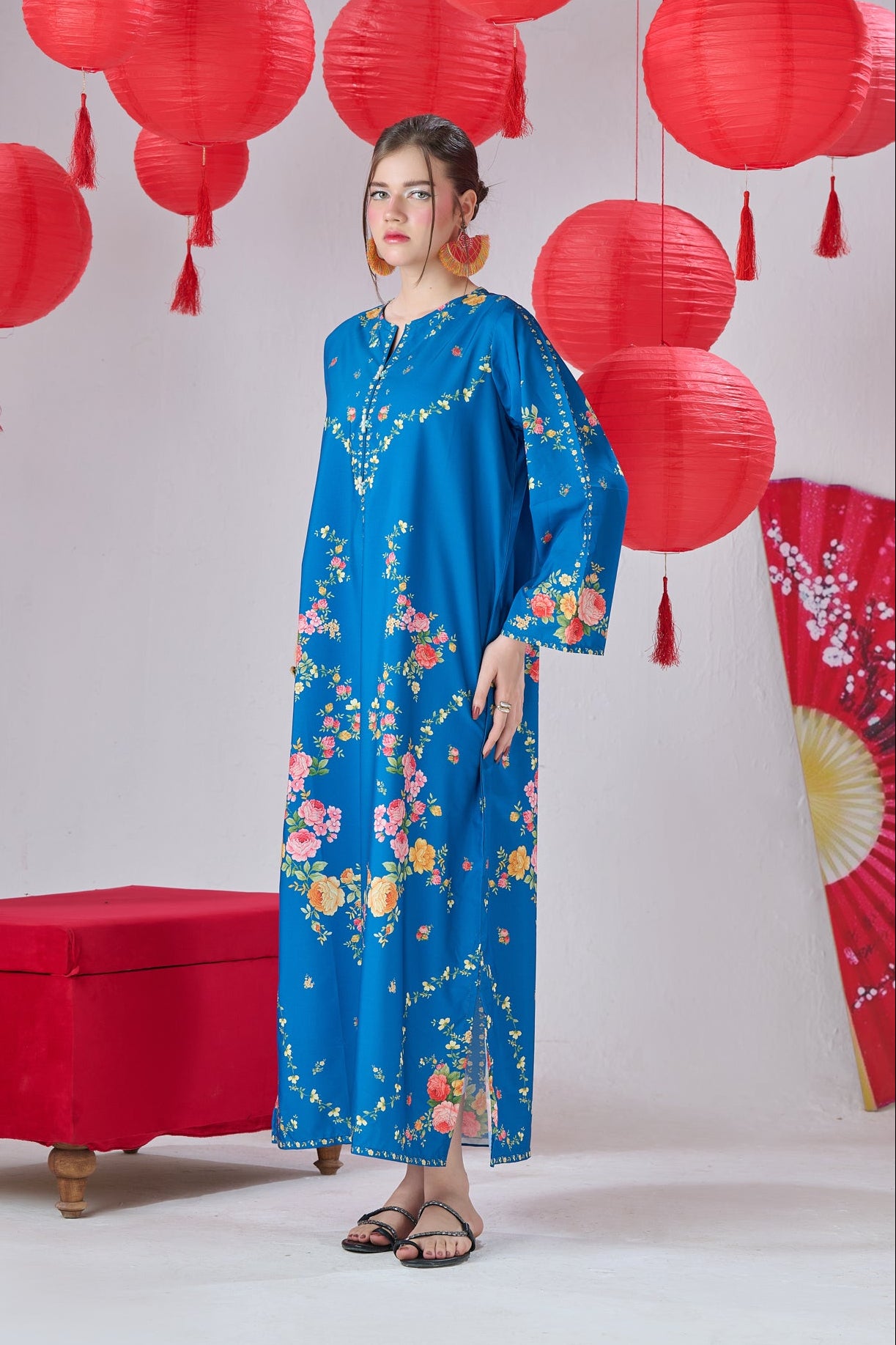 Elevate your style with this two-piece printed kaftan set, crafted from soft, flowy crepe fabric. Lightweight and breathable, it drapes beautifully for all-day comfort, while timeless prints add effortless charm for casual or relaxed occasions. Model is wearing a small size.
